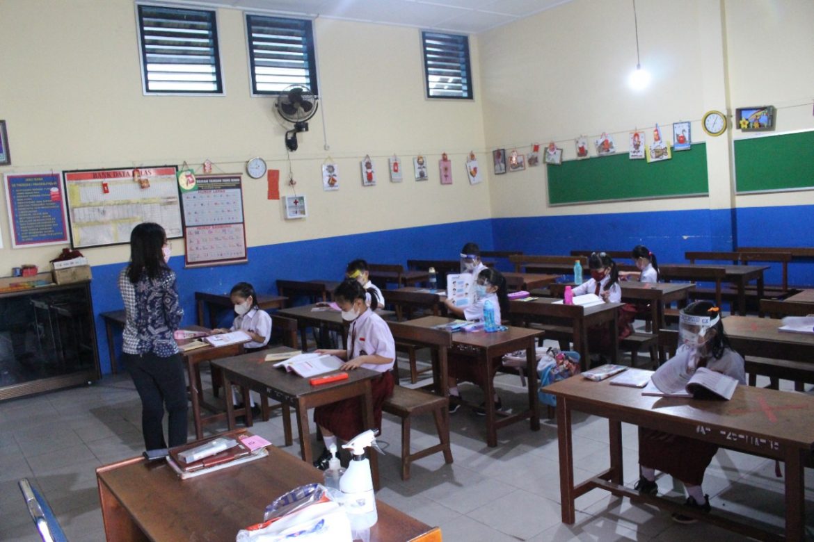 Ia mengungkapkan setiap harinya proses pembelajaran tatap muka di SD Theresia I menerapkan protokol kesehatan (prokes) covid-19 secara ketat, dan setiap kelas dibagi menjadi dua shift mengingat adanya pembatasan jumlah siswa dalam satu kelasnya.