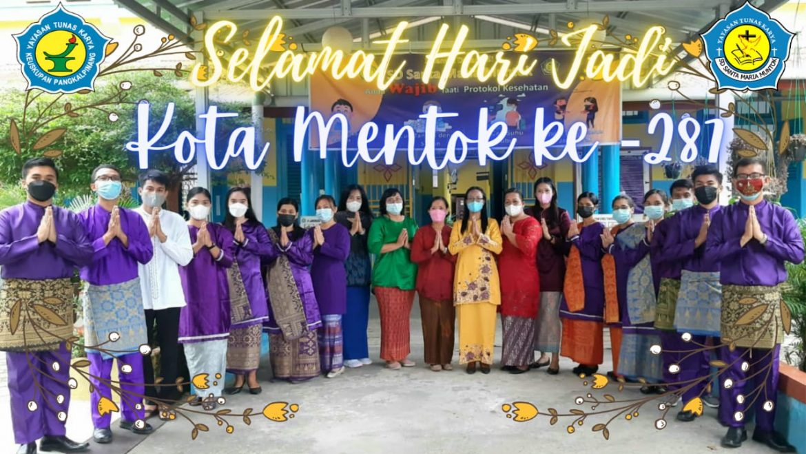 YTKNews.id–Setiap tahunnya, SD Santa Maria Muntok ikut merayakan hari jadi Kota Mentok yang jatuh pada tanggal 7 September. Sesuai dengan anjuran dari pemerintah, para guru dan staf SD Santa Maria mengenakan pakaian adat melayu Mentok berupa baju kurung dan kain songket. Seperti peringatan hari jadi Kota Mentok yang ke-287 di tahun 2021 ini, tampak guru-guru dan staf bersemangat dengan warna-warni baju khas “Bujang Dayang” Bangka Belitung. Semangat “Bujang Dayang” yang energik, kreatif, cerdas dan inspiratif tampak menghiasi para pendidik dan tenaga kependidikan Yayasan Tunas Karya di SD Santa Maria Muntok.