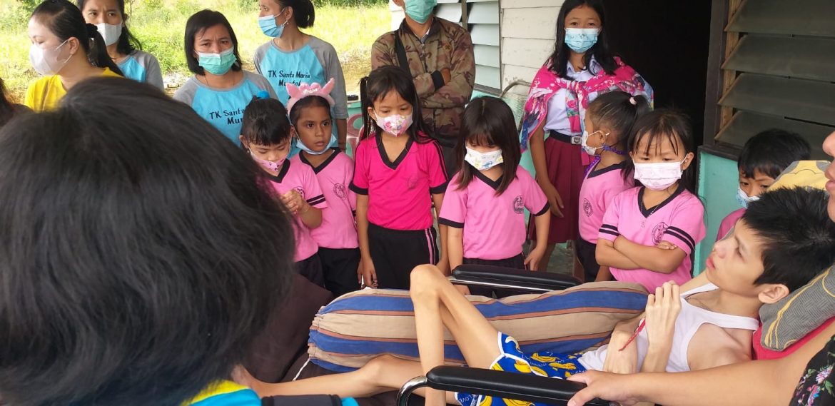 Muntok, YTKNews.id- Dalam rangka menyambut Natal Tahun 2021, perwakilan siswa, orangtua siswa dan guru-guru TK Santa Maria melaksanakan kunjungan kasih ke rumah seorang anak bernama Kevin yang berada di Desa Kadur, Jumat (17/12/2021).