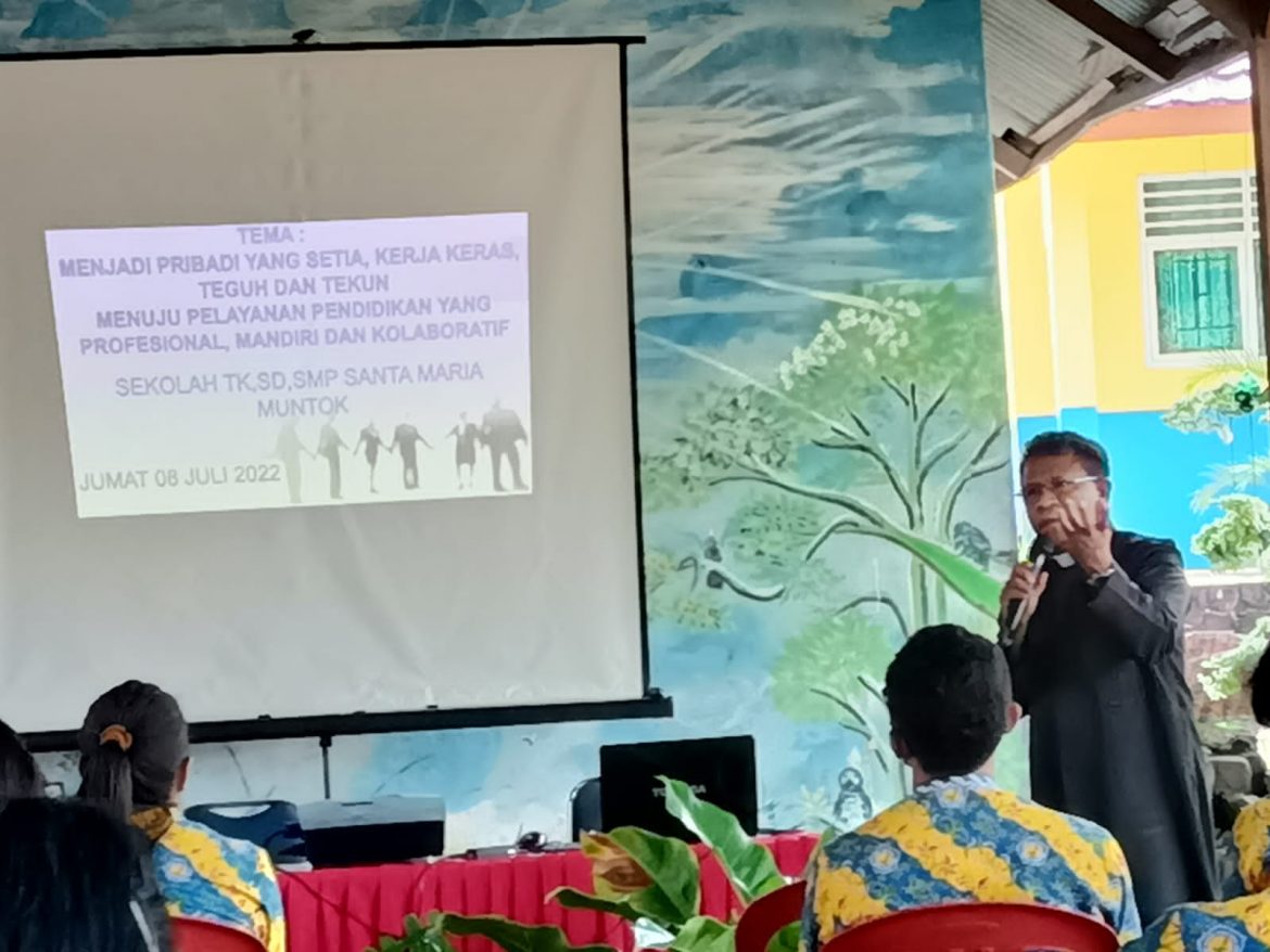Muntok, YTKNews.id – Jumat, 8 Juli 2022 bertempat di SMP Santa Maria, sebanyak 49 orang guru dan pegawai sekolah Santa Maria Muntok mengikuti kegiatan persiapan tahun ajaran 2022/2023. Agenda ini merupakan kegiatan perdana yang menggandeng Romo Paulus Kara sebagai Pastor Paroki Muntok sebagai pembicara.