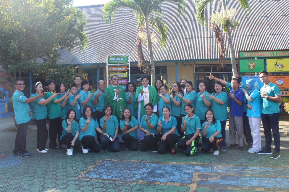 Romo Harry juga mengajak guru karyawan maupun siswa siswi SD Santa Theresia 1 untuk memegang prinsip ‘relasi’. Ia menjelaskan Re berarti melambangkan damai, artinya dalam membangun relasi bersama orang lain kita harus mampu membawa kedamaian.