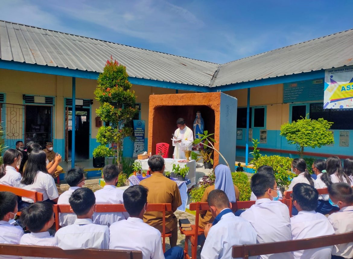 Pastor Paroki Regina Pacis RD Fransiskus Paskalis Maing lah yang memberkati patung Santa Maria Regina Pacis itu. Aura religious pun makin berasa di kompleks SMP Regina Pacis, kecamatan Tanjungpandan itu.