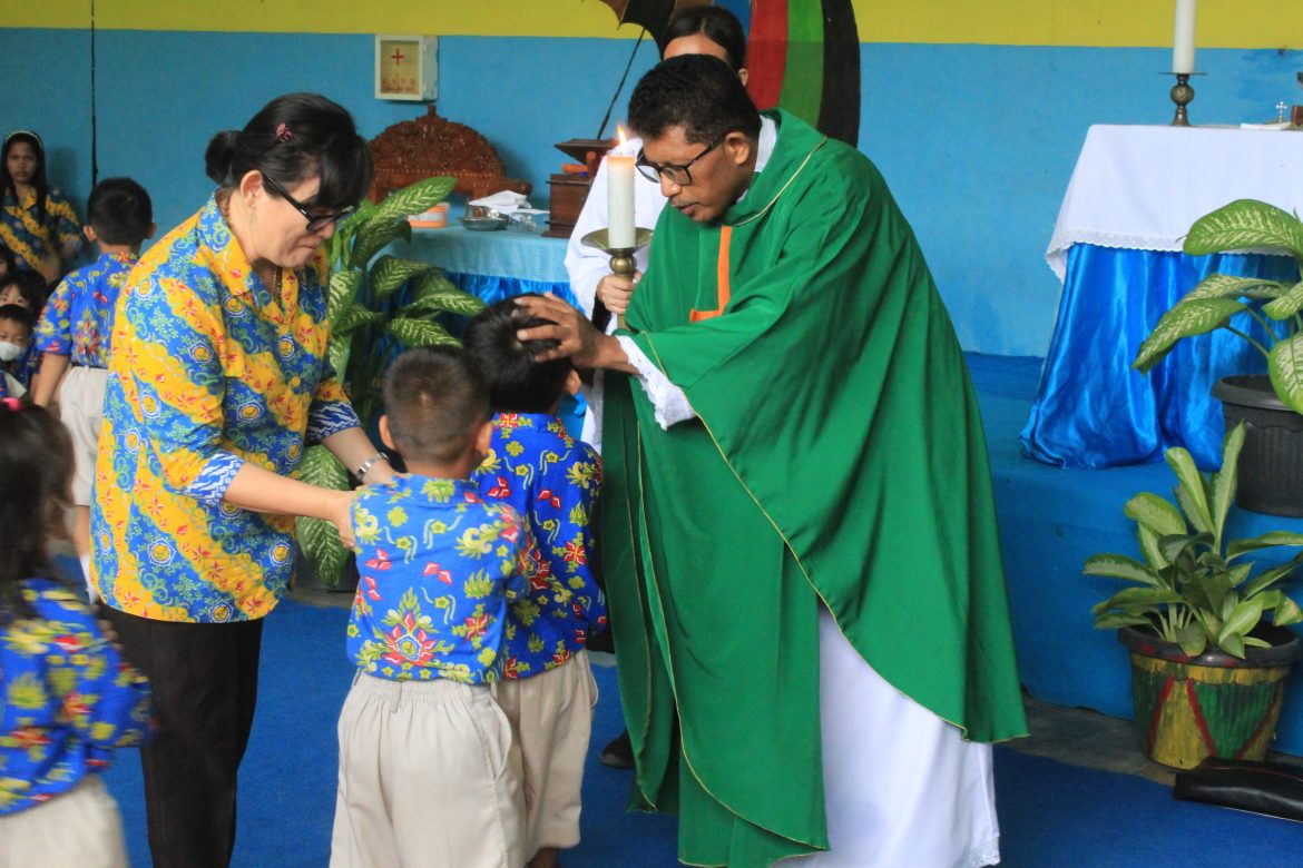 Momen ini makin berarti karena Romo Paroki Gereja Santa Maria Pelindung Para Pelaut Mentok, Romo Markus Malu Pr lah yang memimpin misa penutupan ini. Dalam khotbahnya, Romo Markus Malu yang akrab dipanggil Romo Marko mengajak peserta didik untuk selalu bersyukur dan mengandalkan Tuhan dalam setiap langkah.
