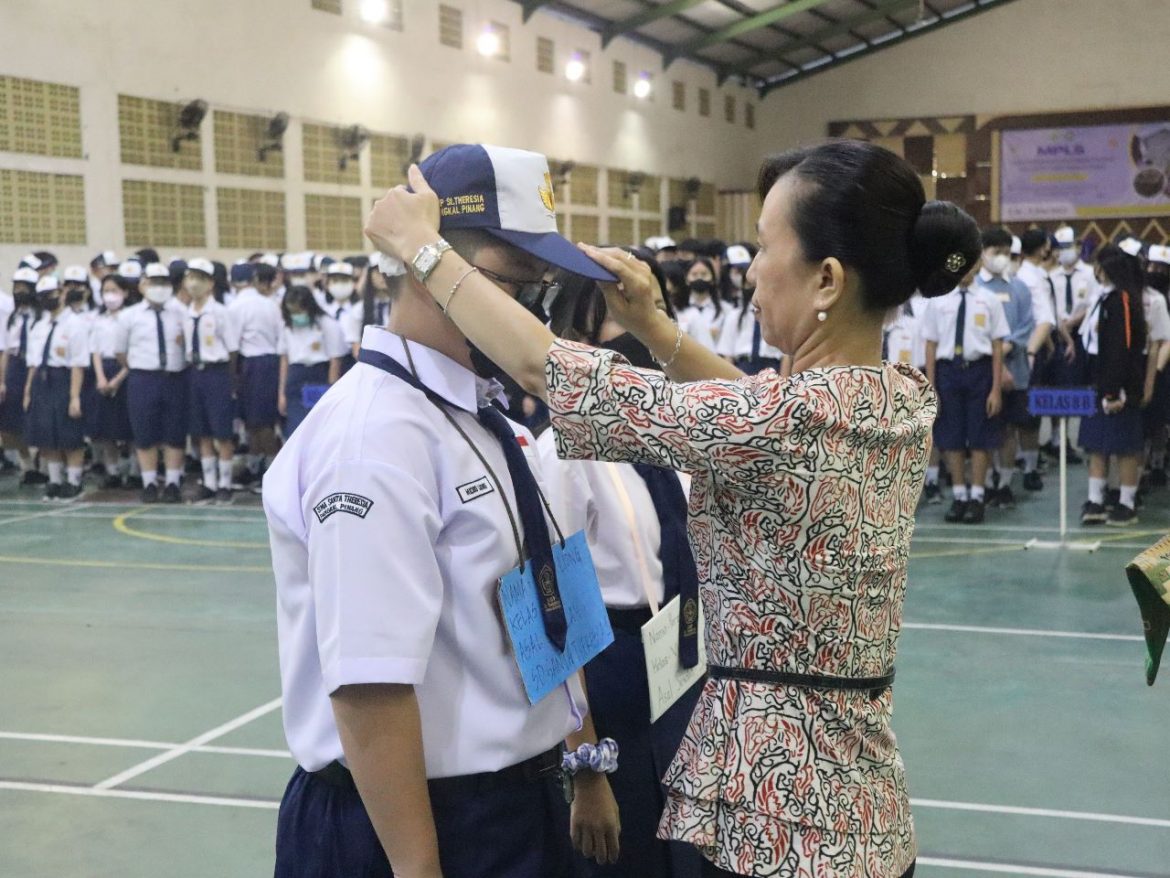 “Tak kenal maka tak sayang …” ungkap Lan Cen, S.Ag selaku kepala sekolah SMP Santa Theresia saat kegiatan pembukaan MPLS berlangsung. Kegiatan yang diikuti oleh seluruh warga sekolah ini juga disisipkan perkenalan singkat bapak dan ibu guru serta mata pelajaran yang diampu. Diakhir kegiatan apel, sesi pemasangan atribut MPLS diwakilkan oleh Michio Liong (VIIC) dan Peregrine Shakira Chealsea Prasangka (VIID) dan diikuti oleh seluruh peserta didik baru setelahnya.