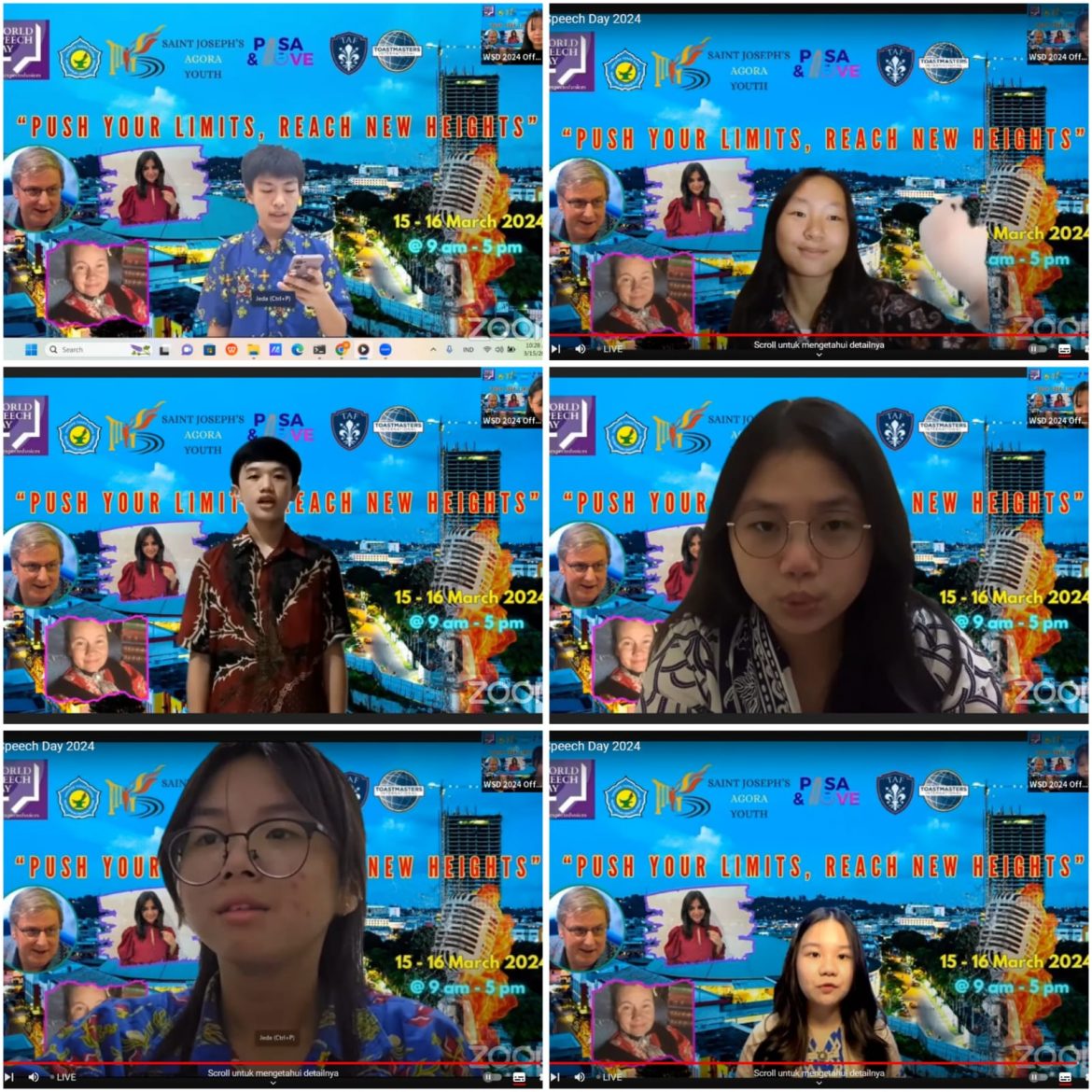 Kegiatan yang dilaksanakan selama dua hari ini, yakni 15-16 Maret 2024 dilaksanakan di Laboratorium Kesenian SMA Santo Yosef lantai 3 ini mengambil tema “Push Your Limits, Reach New Heights”. Kegiatan ini rutin dilakukan setiap tahunnya, tetapi untuk tahun ini dilakukan melalu Zoom Meeting dan livestreaming. Namun, hal ini tidak menyurutkan semangat para peserta untuk menyampaikan ide, gagasan, pendapat, serta harapan dimasa yang akan datang supaya kita bisa memiliki dunia yang lebih baik. Persiapan demi persiapan dilakukan oleh anak-anak SMP Santa Theresia agar dapat memberikan penampilan terbaiknya. Mereka mempersiapkan naskah, berkonsultasi dan bahkan menerjemahkan ke dalam Bahasa Mandarin serta membuat video dengan didampingi guru pendamping.