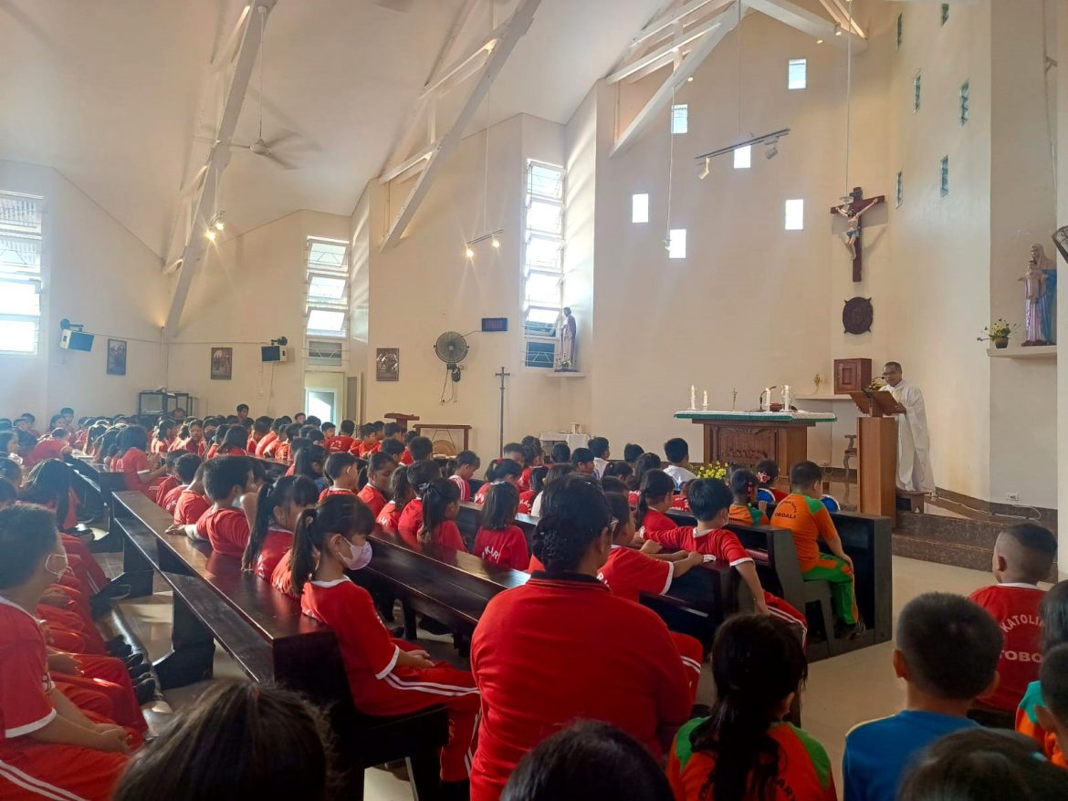 Hari itu, Jumat,26 Juli 2024, Gereja Stella Maris, dipunhi seluruh peserta didik dari TK dan SD Karya. Uniknya, tidak hanya peserta didik dari katolik saja yang hadir, tetapi juga, non katolik ikut merayakan misa itu.