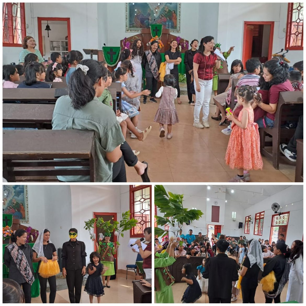 Mentok,YTKNews- Minggu lalu, suasana riang pecah di Gereja HKBP dan GEPEKRIS saat guru-guru TK Santa Maria menyajikan pertunjukan drama bertema “Adam dan Hawa Jatuh Kedalam Dosa”. Acara ini merupakan bagian dari “Gerakan YTK Mengajar”, sebuah inisiatif untuk memperkenalkan sekolah kepada jemaat dan menanamkan nilai-nilai agama pada anak-anak.