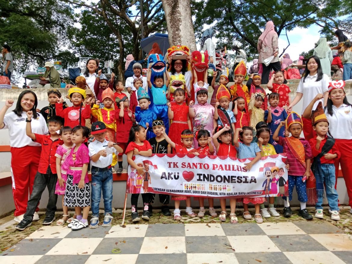 Pangkalpinang, YTKNews.id — TK Santo Paulus Pangkalpinang berserta para guru dan orang tua murid berbondong-bondong ke lapangan merdeka Pangkalpinang pada 22 Agustus lalu yakni untuk berpartisipasi dalam karnaval anak-anak yang dihadiri 135 regu se-Kodya Pangkalpinang. TK Santo Paulus Pangkalpinang mendapat giliran nomor 3, semua anak-anak bersama orang tua murid sangat antusias mengikuti kegiatan pawai tersebut. Tampak wajah ceria dari anak-anak, mereka didandani sangat anggun dan cantik oleh para orang tua dan guru. Pada karnaval ini, tema yang diambil oleh TK Santo Paulus adalah “Aku Cinta Indonesia dengan Keragaman Adat, Suku dan Seni Budaya, Kita adalah Satu Indonesia”. Berkaitan dengan tema yang ada, anak-anak mengenakan kostum adat nusantara.