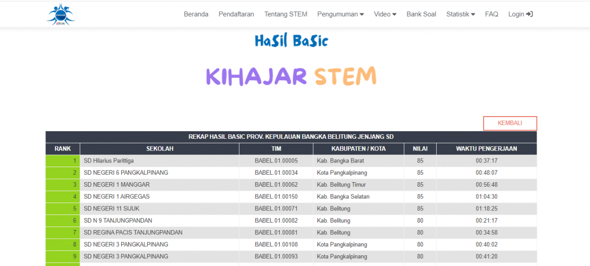 Pada web kihajar.kemdikbud.go.id terdapat 150 tim dari seluruh Kabupaten di Provinsi Kepulauan Bangka Belitung, yang berkompetisi mengikuti kegaiatan ini secara daring. Tim SD Hilarius berhasil menorehkan catatan nilai 85, dengan waktu pengerjaan 37 menit 17 detik, dari 20 soal yang diberikan, menjadikannya yang tercepat.