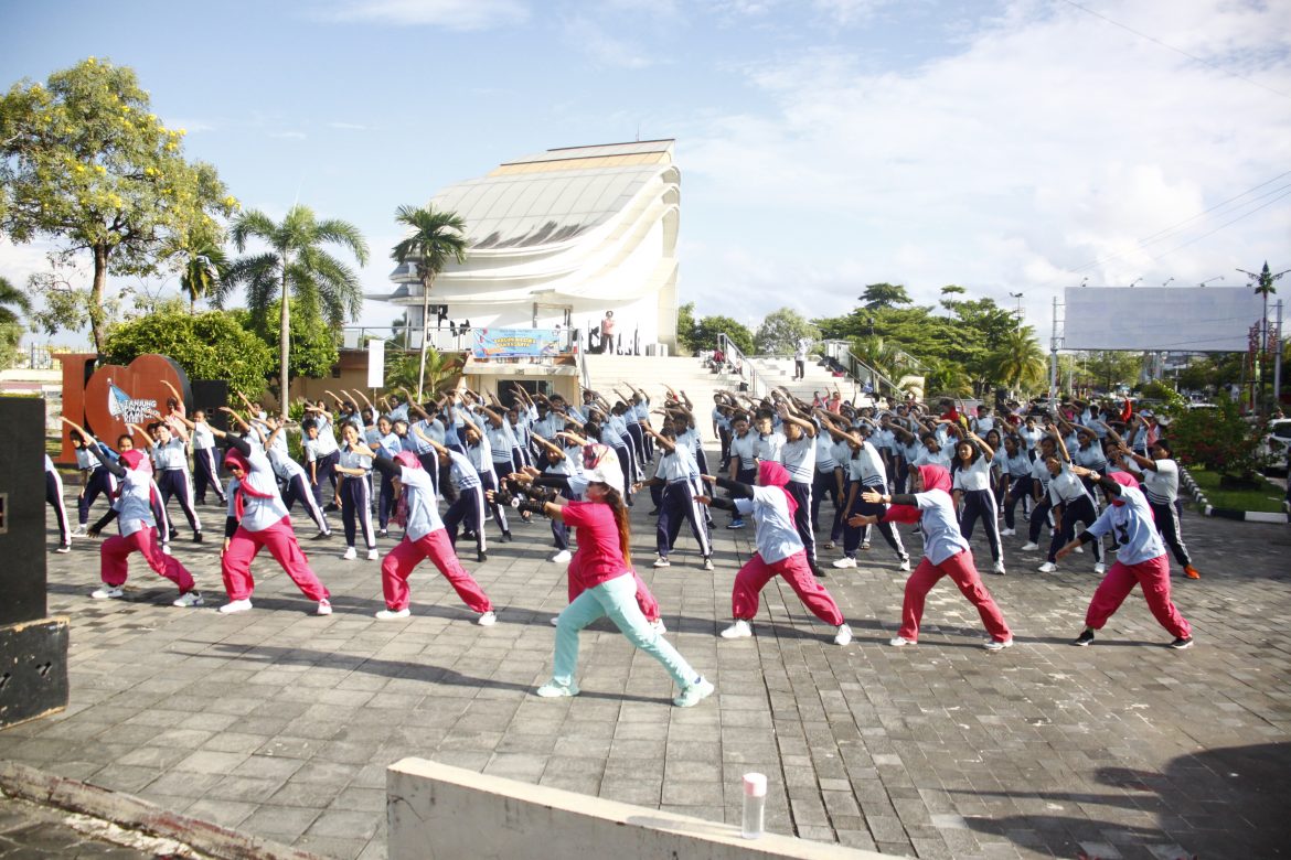 Seluruh peserta didik dan orang tua tampak antusias dan senang saat mengikuti senam bersama, dengan suara musik yang keras dan instruktur yang begitu semangat cukup mencuri perhatian masyarakat saat melewati tepi laut tersebut.