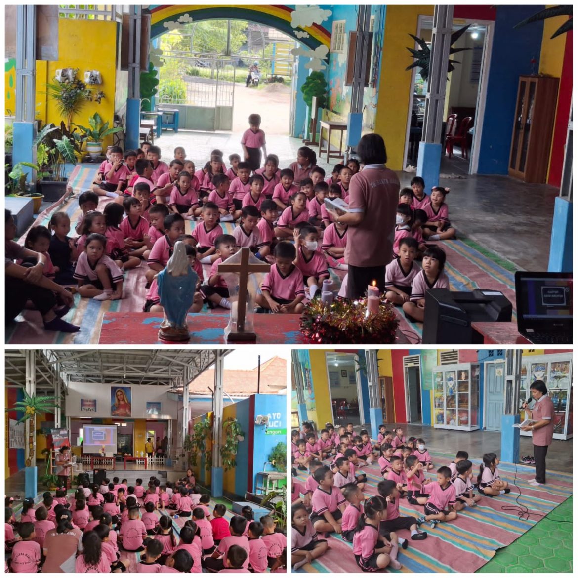 Dalam suasana penuh kehangatan, anak-anak berkumpul di Aula sekolah. Mereka membangun keseruan dengan nyanyian seru, story telling tentang “Kelahiran Yesus Kristus” dan menjelaskan arti masa advent. Anak-anak menyimak dengan sunguh-sungguh dan ketika ditanya mereka terlibat aktif menjawab pertanyaan tentang cerita tersebut.