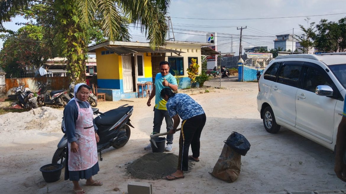 PARITTIGA, YTKNews.id – Saat jam kosong mengajar, Suster Felisitas dan Bu Tina terlihat duduk di depan ruang guru TK memegang sendok semen, mencampur aduk semen dan pasir hingga merata. Kemudian, tampak seperti seorang profesional, dengan hati – hati keduanya melempar campuran semen di antara batu-bata, membuat perekat antara bata tersebut.