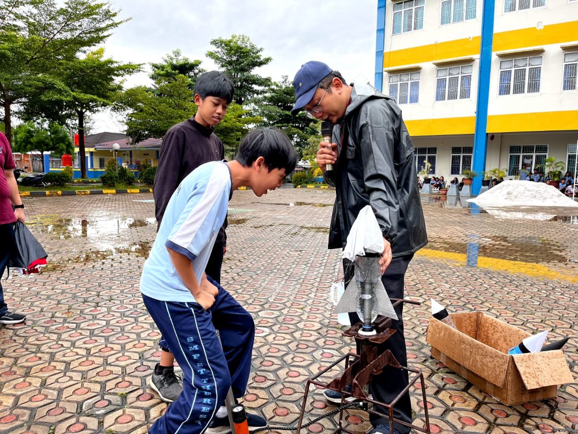 Pangkalpinang, YTKNews.id — “Wow keren! Tinggi sekali!” ungkap para peserta didik yang terkesima ketika menyaksikan peluncuran roket air. Peluncuran ini merupakan salah satu kegiatan dalam Projek Penguatan Profil Pelajar Pancasila (P5) dengan tema “Rekayasa dan Teknologi” di SMP Santa Theresia. Kegiatan P5 hari pertama ini diikuti oleh para peserta didik kelas 7 hingga kelas 9. Serangkaian acara ini dikemas dengan sangat menarik, dimulai dari penjelasan tentang rekayasa dan teknologi serta peluncuran roket air oleh para guru hingga praktik pembuatan roket air oleh para peserta didik.