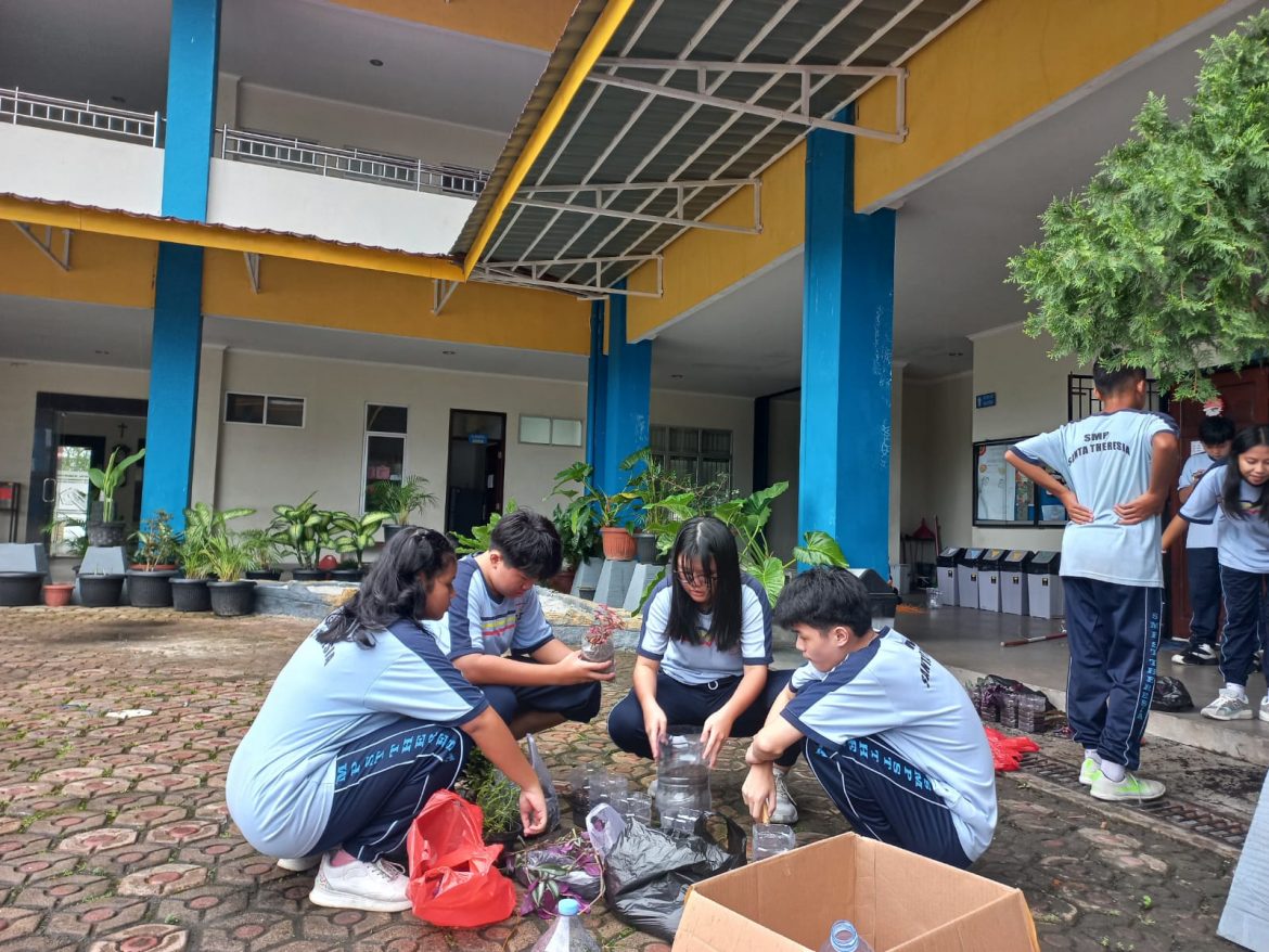 Peserta didik yang sudah dibentuk dalam kelompok-kelompok kecil terlihat mulai sibuk menata dan menanam tanaman di dalam pot. Adapun pot yang digunakan untuk digantung di depan kelas adalah botol Le Minerale kemasan 5 liter sedangkan pot yang digunakan untuk digantung di tembok area lapangan olahraga adalah botol Pocari Sweat kemasan 2 liter. Botol-botol ini sudah jauh-jauh hari dipersiapkan oleh peserta didik bahkan sebelum P5 dimulai. Sedangkan untuk tanaman yang akan ditanam sudah diinfokan pada hari sebelumnya. Untuk tanaman yang dibawa sangat beragam. Namun, khusus untuk gantungan di depan kelas, peserta didik dianjurkan untuk membawa tanaman Krokot atau tanaman menjuntai sejenisnya. Hal ini dikarenakan adanya harapan agar Krokot yang ditanam dapat memperindah pekarangan depan kelas dengan untaian-untaiannya yang menjulur ke bawah gantungan.