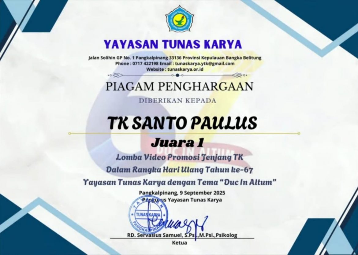 Dengan prestasi ini, TK Santo Paulus Pangkalpinang semakin memperkuat reputasinya sebagai lembaga pendidikan yang kreatif dan berkomitmen dalam membentuk generasi muda yang unggul dan berkarakter.