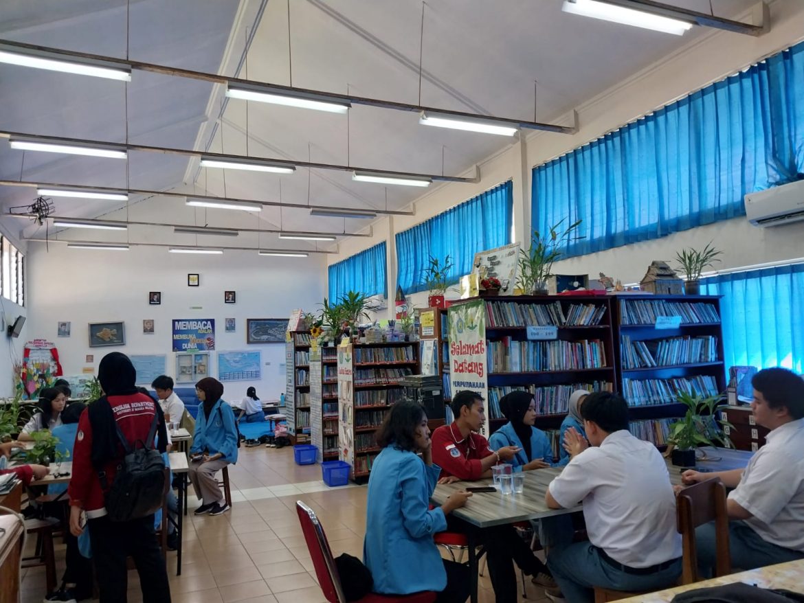 Memperlihatkan interaksi hangat antara mahasiswa dan siswa: duduk melingkar di meja-meja perpustakaan, berdiskusi, mencatat jawaban, hingga berbagi tawa kecil di sela-sela wawancara. Suasana akrab itu menegaskan bahwa kegiatan ini bukan hanya sekadar tugas perkuliahan, tetapi juga wadah pembelajaran bersama lintas jenjang, tutur Falentina Martini, Pustakawati