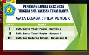 Pangkalpinang, YTKNews.id – SMA Santo Yosef kembali menorehkan prestasi gemilang di kancah antarprovinsi. Dalam ajang Lomba Karya Seni dan Sastra (LKS2) yang diadakan oleh Yayasan Tunas Karya, dua tim film pendek dari SMA Santo Yosef berhasil meraih Juara 1 dan Juara 2 sekaligus. Pengumuman pemenang dilaksanakan pada Jumat, 24 Oktober 2025, bertempat di SMA Santa Maria Tanjung Pinang.