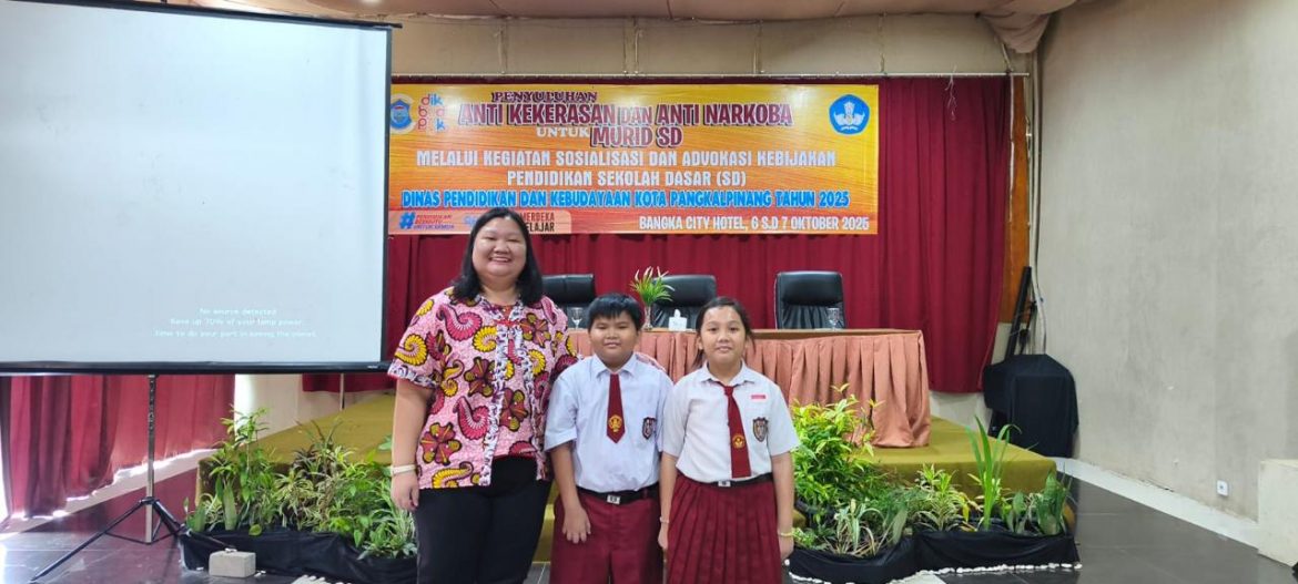 Pangkalpinang, YTKNews.id – Suasana penuh semangat terlihat di aula Bangka City Hotel, tempat berlangsungnya kegiatan Penyuluhan Anti Kekerasan dan Anti Narkoba untuk Murid Sekolah Dasar yang diselenggarakan oleh Dinas Pendidikan dan Kebudayaan Kota Pangkalpinang.