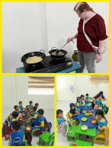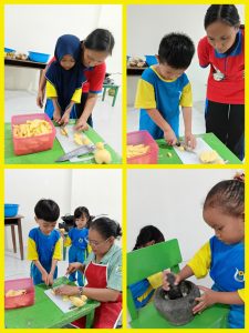 Dengan tangan mungil dan semangat yang besar, anak-anak belajar memotong, menumbuk, dan mencampur bahan-bahan sederhana. Para guru mendampingi dengan penuh kasih, memastikan setiap anak merasa aman, bahagia, dan bangga atas usahanya.