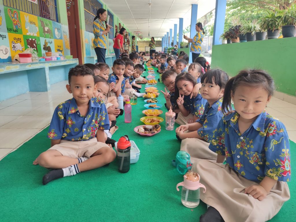 Kegiatan makan bersama ini bukan hanya sekadar menikmati makanan, tetapi juga menanamkan nilai-nilai penting seperti kebersamaan, rasa syukur, gotong royong, dan cinta terhadap hasil bumi Indonesia. Guru juga mengingatkan anak-anak untuk selalu menghabiskan makanan mereka dan tidak membuang makanan dengan sembarangan, sebagai bentuk penghargaan terhadap petani dan alam.