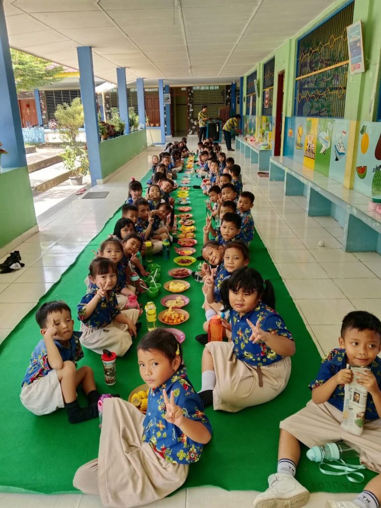 Usai sesi edukasi, kegiatan dilanjutkan dengan acara nganggung bersama, yaitu tradisi makan bersama di mana setiap anak meletakkan makanan yang dibawa di teras sekolah. Suasana kekeluargaan sangat terasa ketika anak-anak, guru, dan staf sekolah duduk melingkar sambil menikmati berbagai hidangan yang dibawa. Mereka saling berbagi makanan, mencicipi hasil olahan teman-teman lain, dan belajar berbagi dengan penuh keceriaan.