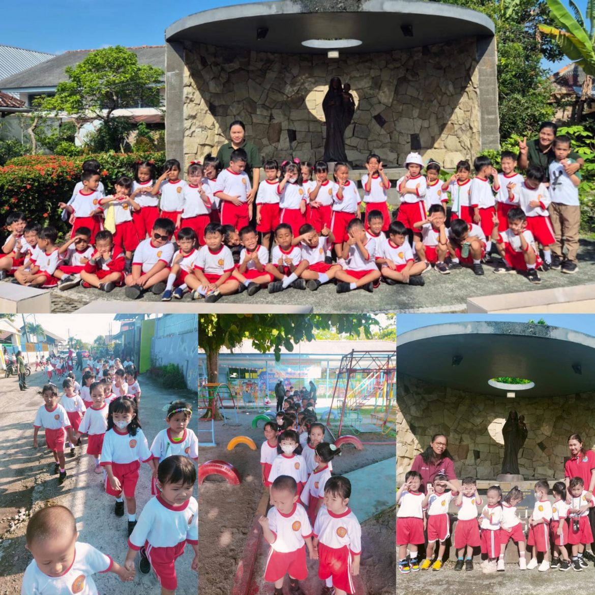 Suasana kemudian berubah menjadi lebih tenang. Anak-anak diajak berdoa bersama, mengenal tempat ibadah, dan belajar menghargai ketenangan serta kekhidmatan di tempat suci. Tak hanya murid TK, anak-anak Kelompok Bermain pun turut bergabung dalam doa bersama tersebut.