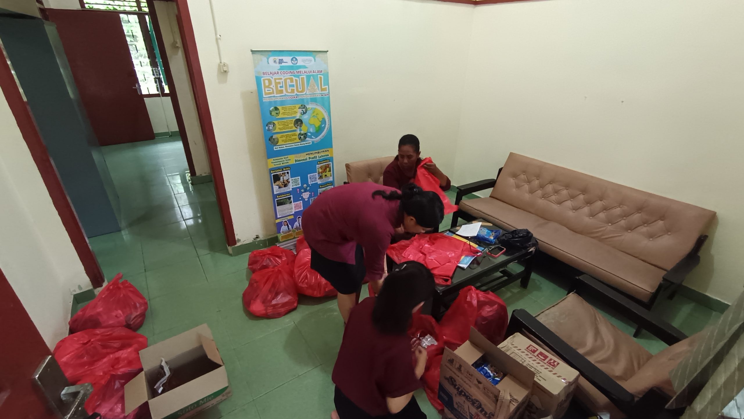Kepala sekolah dan guru mengemas paket Natal