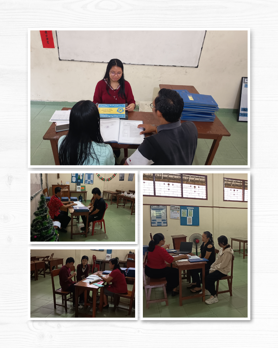 Meskipun antrean terlihat cukup panjang, para orang tua tampak sangat bersabar menunggu giliran bersama putra-putri mereka. Kesabaran ini menjadi bukti dukungan penuh keluarga terhadap proses pendidikan di SMP Santa Maria. Efektivitas waktu tetap terjaga berkat koordinasi guru yang sigap mengatur alur diskusi agar setiap keluarga mendapatkan ruang bicara yang cukup.