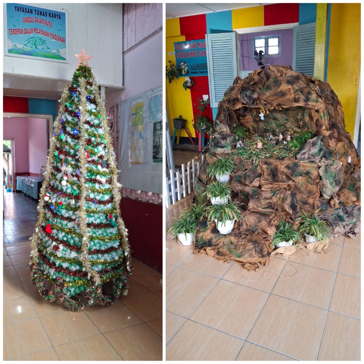 Berbagai bahan bekas seperti rak telur, bambu hingga kertas bungkus rokok disulap menjadi hiasan natal yang cantik dan penuh makna. Pohon natal dari bahan bekas berdiri dengan megah, sementara kandang natal yang dibuat dengan penuh ketelatenan menjadi pusat perhatian dan sarat nilai religius yang menghiasi sudut-sudut sekolah, menciptakan suasana yang meriah dan penuh sukacita.