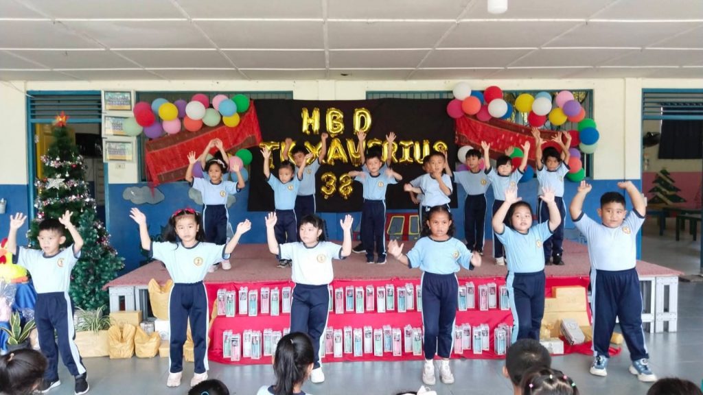 Pangkalpinang, YTKNews.id — TK Xaverius merayakan hari ulang tahun ke 38 pada 17 Desember lalu yang dihadiri oleh guru, karyawan, serta peserta didik yang didampingi oleh orangtuanya. Perayaan HUT sekolah ini rutin diadakan setiap tahunnya di halaman sekolah TK Xaverius.