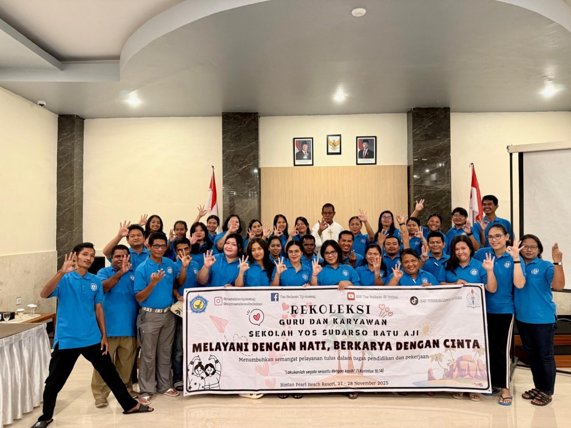 Batam, YTKNews.id – Dalam rangka mempererat tali persaudaraan, meningkatkan kualitas pelayanan, dan menyegarkan kembali semangat berkarya, para guru dan karyawan dari tiga unit sekolah Yos Sudarso di wilayah Batu Aji, yakni TK Yos Sudarso 3, SD Yos Sudarso 3, dan SMP Yos Sudarso 2, menggelar kegiatan rekoleksi selama tiga hari, mulai tanggal 27 November hingga 29 November 2025. Perjalanan yang menandai dimulainya kegiatan rohani ini dimulai dari Pelabuhan Punggur, Batam, di mana seluruh peserta rekoleksi tampil seragam mengenakan busana putih-putih, menyiratkan kesucian hati dan semangat baru. Menempuh waktu kurang lebih 1,5 jam perjalanan laut dengan ombak yang lumayan tenang. Rombongan tiba dengan selamat di Pelabuhan Uban, Pulau Bintan dan disambut dengan pemandangan khas pesisir yang menenangkan. Dari pelabuhan, mereka dijemput menggunakan kombinasi 1 bus berukuran sedang dan 1 minibus untuk melanjutkan perjalanan darat selama kurang lebih satu jam menuju lokasi utama, Bintan Pearl Beach Resort, yang segera memanjakan mata dengan panorama lautnya yang indah memukau, menjadi latar sempurna bagi kontemplasi dan kebersamaan.