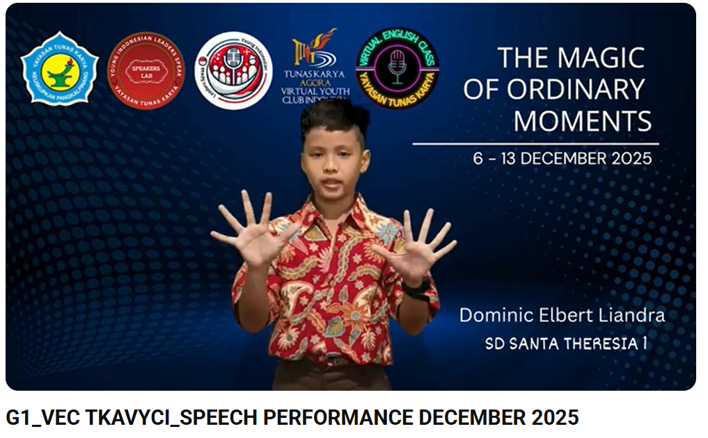 Pangkalpinang , YTKNews.id – Program Virtual English Class (VEC) Yayasan Tunas Karya (YTK) kembali menutup kegiatan semester ini dengan gelaran VEC YTK Speech Performances, sebuah ajang yang menampilkan kemampuan berbahasa Inggris para peserta dari berbagai sekolah YTK. Acara ini sekaligus menjadi momen penutup pertemuan VEC pada semester akhir tahun 2025.