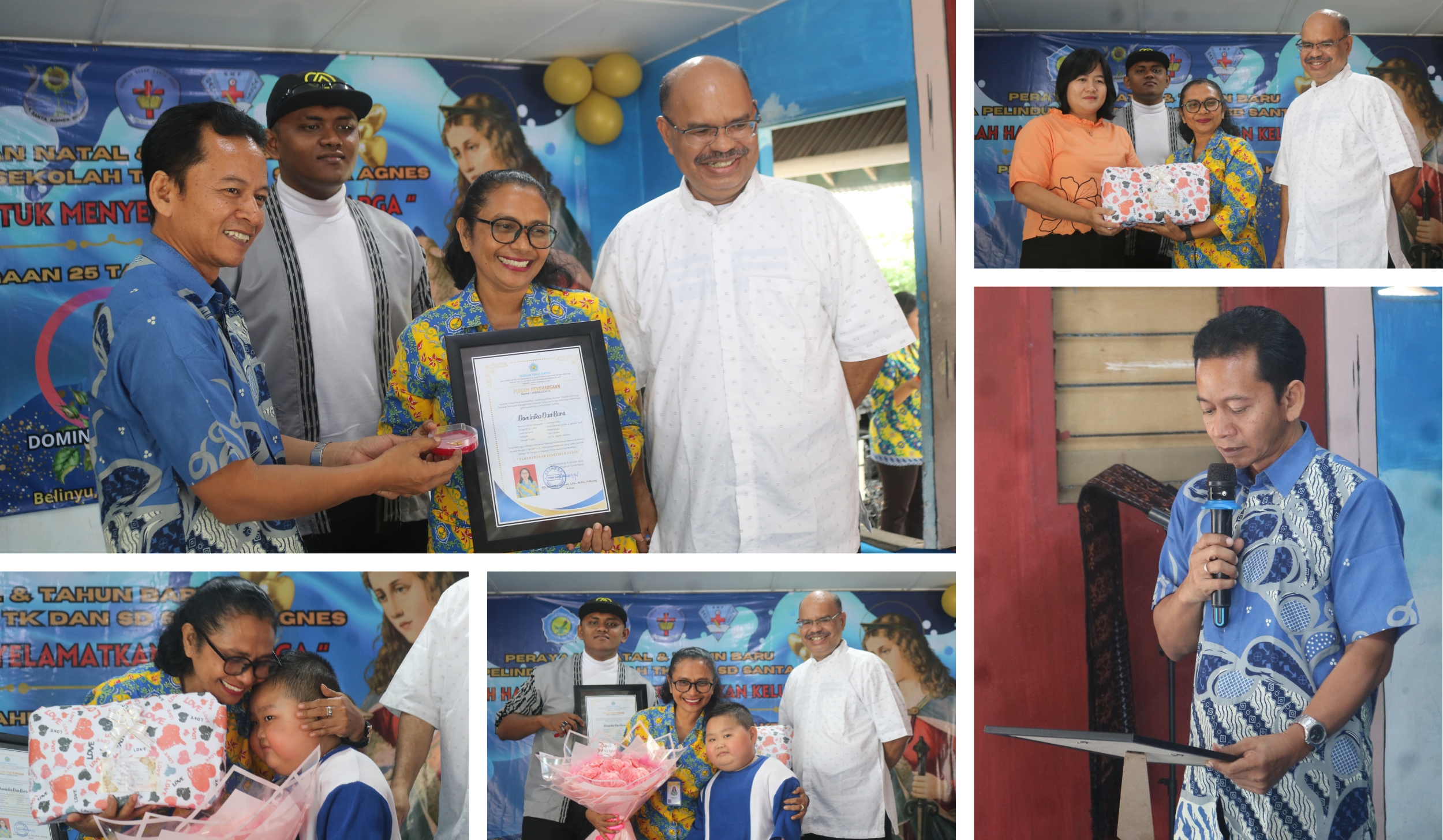 Usai sambutan dan penampilan, acara berlanjut pada momen yang penuh haru, yakni pemberian penghargaan atas 25 tahun perjalanan dan pengabdian Ibu Dominika Dua Bura, yang akrab disapa Ibu Yanti. Penghargaan tersebut diserahkan langsung oleh Perwakilan Yayasan Tunas Karya, Kristiawan Tri Wardana, didampingi oleh Pastor Anton Moa Tolipung, dengan kehadiran putra tercinta Ibu Yanti, Agung. Selain dari Yayasan, apresiasi juga diberikan oleh perwakilan Komite SD Santa Agnes serta perwakilan siswa.