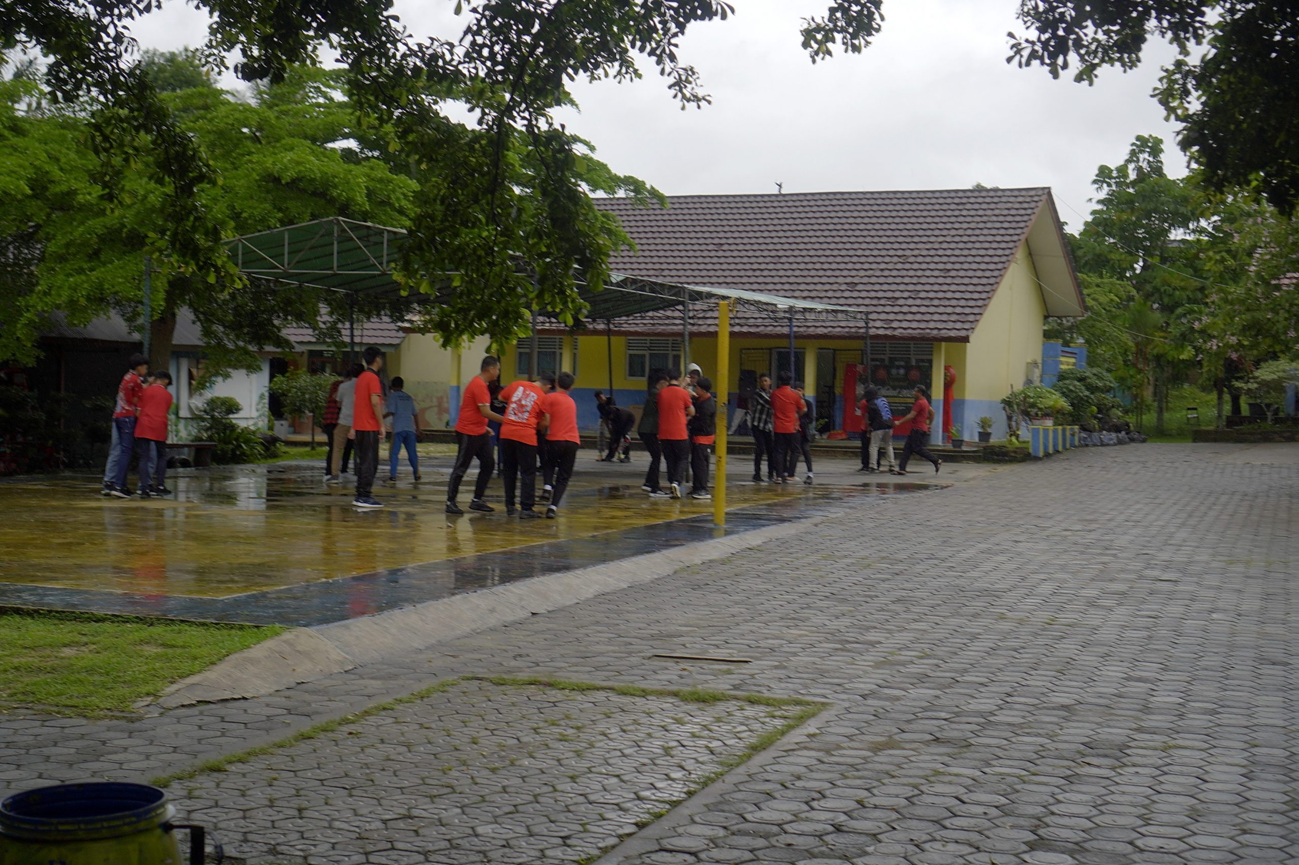 OSIS dan Siswa secara spontan bergerak memindahkan tenda ke tempat yang lebih strategis di tengah guyur hujan