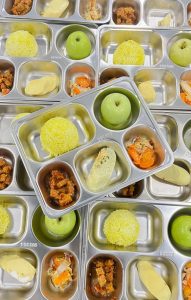 Setelah wali kelas membagikan ompreng kepada murid, kemudian mereka mencuci tangan dan berdoa bersama sebelum mulai menikmati hidangan yang diberikan.