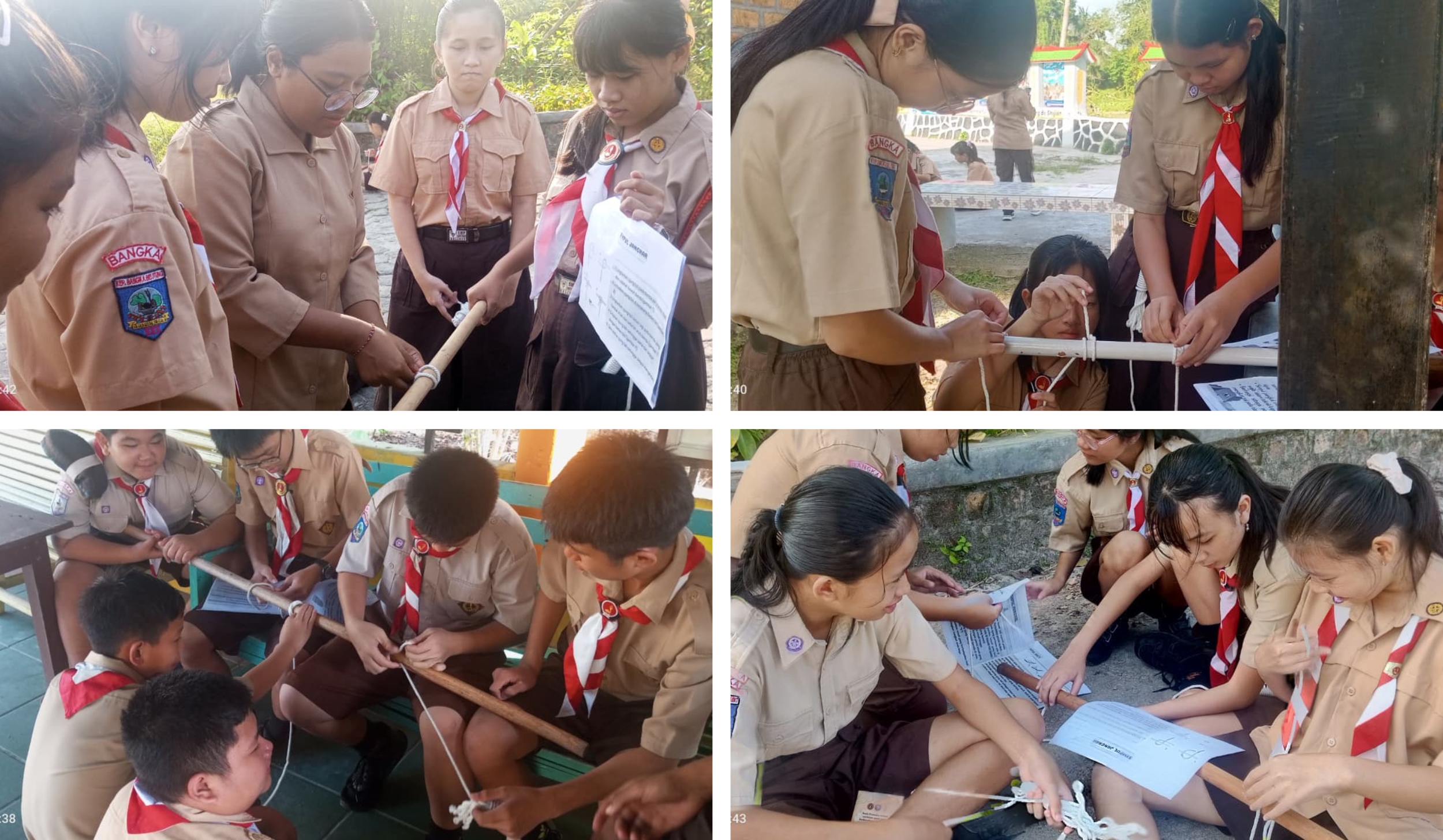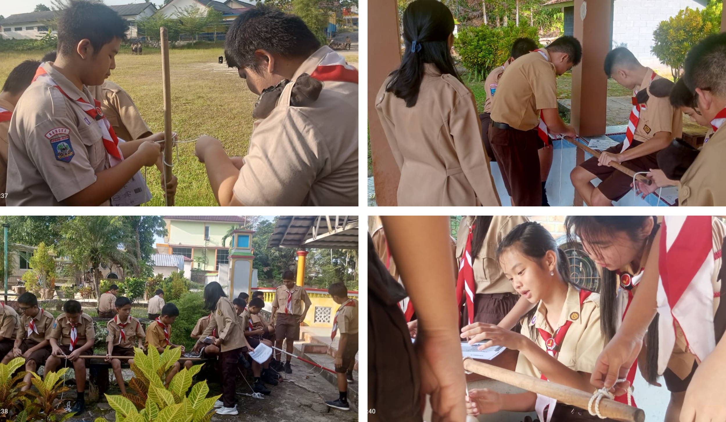 Kegiatan membuat simpul tali berlangsung dengan penuh antusias dan suasana yang sangat hidup. Para murid tidak hanya duduk di lapangan, tetapi juga berkelompok di berbagai tempat yang bisa digunakan untuk belajar, seperti di pendopo dan sudut-sudut area sekitar lapangan. Masing-masing siswa memegang seutas tali pramuka sambil memperhatikan arahan dari kakak-kakak pembina. Dengan sabar, para pembina mendemonstrasikan cara membuat simpul mati, simpul hidup, dan simpul pangkal. Murid-murid pun mencoba mempraktikkannya satu per satu, saling membantu, bertanya, dan memperbaiki simpul yang masih kurang rapi. Suasana belajar terasa hangat, penuh tawa, kebersamaan, dan semangat, namun tetap serius dan terarah, mencerminkan proses pembelajaran yang aktif, kolaboratif, dan menyenangkan.
