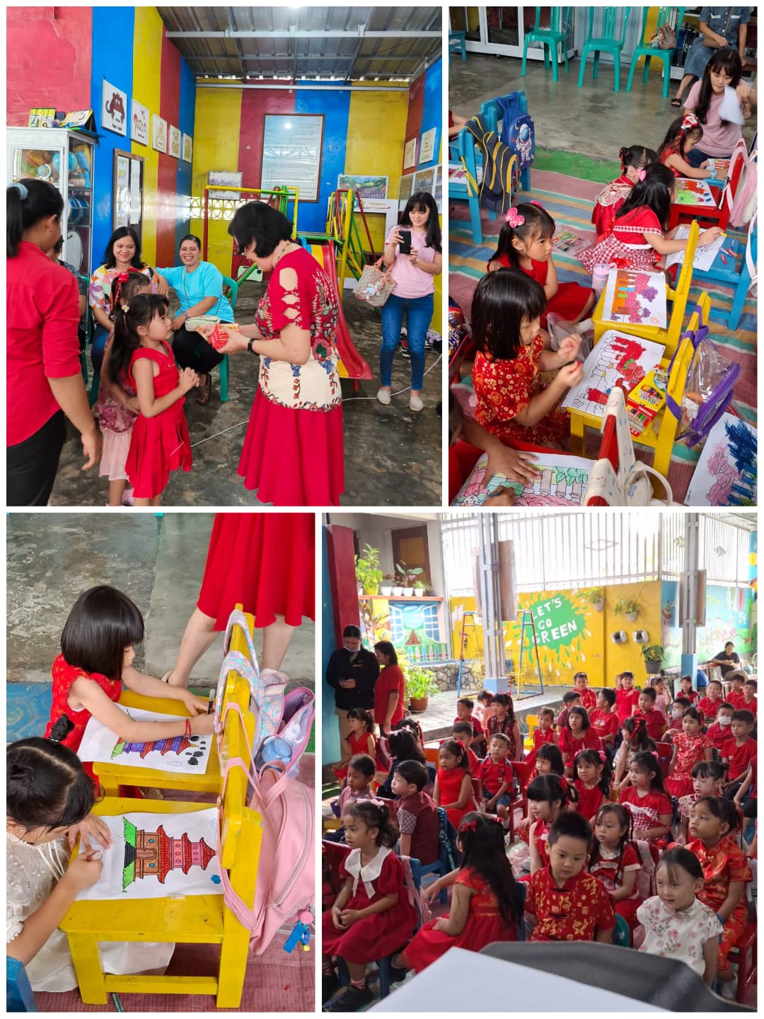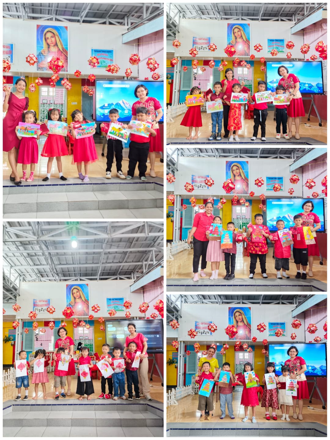 Anak-anak mengikuti berbagai kegiatan dengan begitu semangat. Tawa ceria dan wajah penuh semangat menghiasi setiap momen, anak-anak tampak antusias mengikuti kegiatan mewarnai bertema Imlek. Dengan krayon di tangan dan senyum ceria, mereka menuangkan kreativitas melalui gambar-gambar lampion, barongsai, dan klenteng yang penuh warna. Tangan-tangan kecil mereka begitu bersemangat menyelesaikan karya terbaiknya, sementara para guru mendampingi dengan sabar dan memberikan motivasi. Tidak sekedar mewarnai, kegiatan ini menjadi momen edukatif untuk mengenalkan makna Tahun Baru Imlek. Sebagai bentuk apresiasi , hasil karya mereka pun dipilih lima karya terbaik setiap kelas dan menerima apreasiasi hadiah kecil dengan mempertimbangkan kerapian, kebersihan, kreativitas serta keberanian memadukan warna.