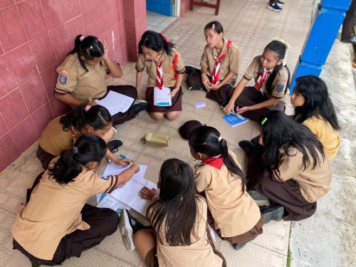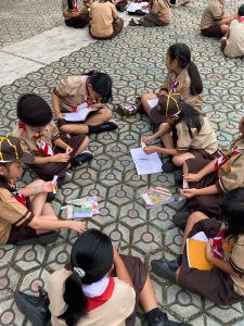 Siswa kelas kecil mengekspresikan semangat kepanduan melalui warna-warni ceria di atas kertas.