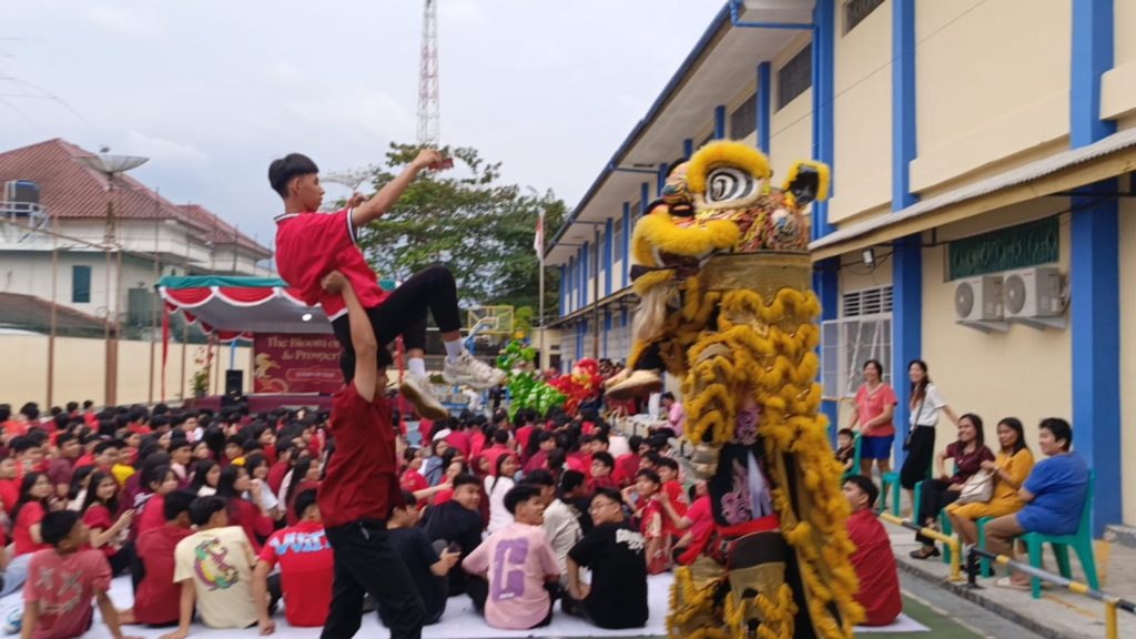Pangkapinang, YTKNews. id — Santher Lion Dance dari SMP Santa Theresia berhasil menampilkan atraksi yang selalu ditunggu-tunggu oleh penonton. Klub yang dibentuk dalam kegiatan ekstrakurikuler ini semakin dikenal oleh masyarakat yakni sering diundang di acara-acara kebersamaan. Salah satu kegiatannya adalah sebagai pengisi acara di SMK Tunas Karya Pangkalpinang dalam rangka hari raya Imlek dan Hari Valentine bagi siswa/siswi SMK Tunas Karya Pangkalpinang. Rombongan Santer Lion Dance dari SMP Santa Theresia ikut serta sebagai peengisi acara dengan menampilkan atraksi barongsai.