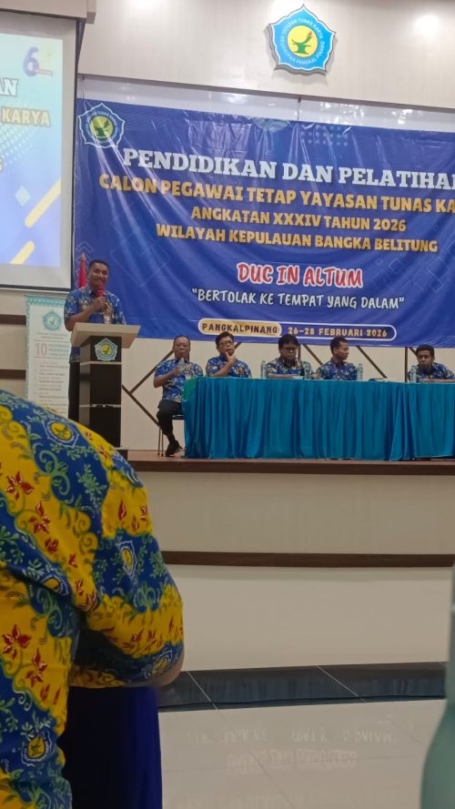 Pangkalpinang, YTKNews.id –Diklat Calon Pegawai Tetap (CPT) di wilayah Kepulauan Riau (Kepri) sukses digelar. Mengingat bahwa unit karya Yayasan Tunas Karya (YTK) tidak hanya di wilayah Kepri, kali ini yayasan kembali menggelar kegiatan yang sama di wilayah Bangka Belitung (Babel). Diklat CPT Angkatan XXXIV ini laksanakan pada Kamis, 26 Februari hingga Sabtu, 28 Februari 2026 dengan Tema “DUC IN ALTUM”.