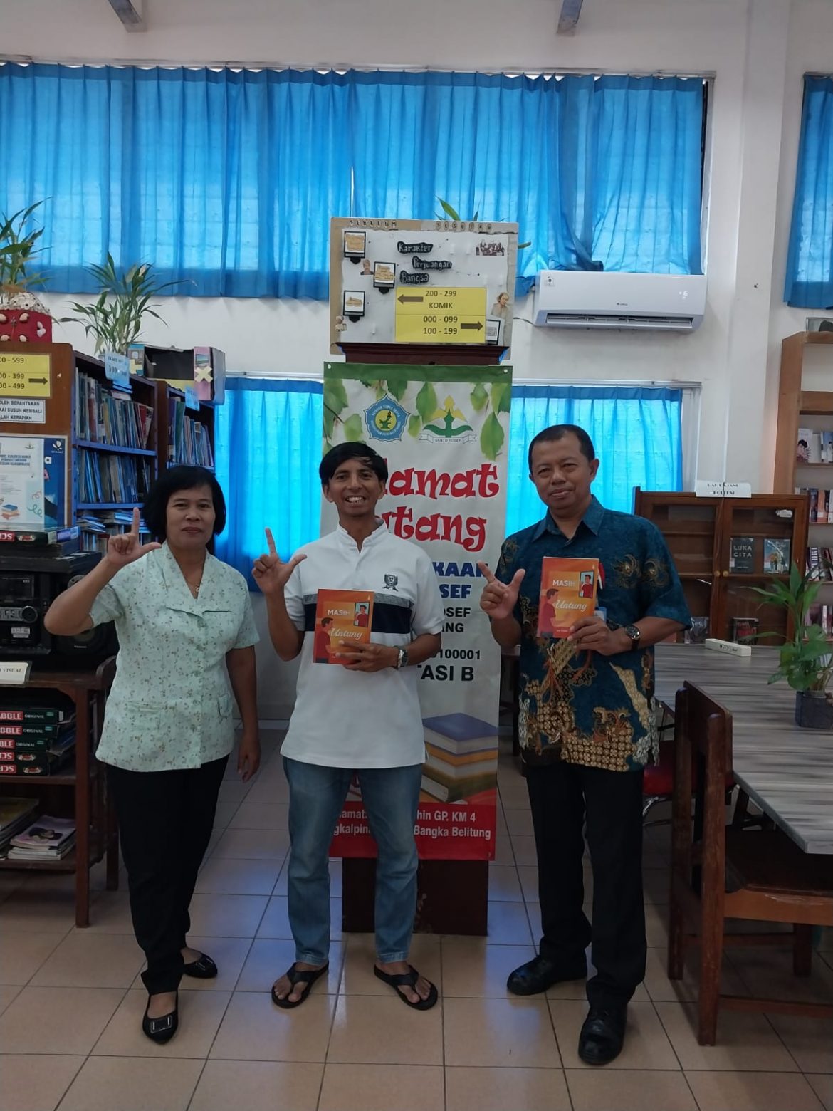 Dalam momen hangat yang diabadikan , Romo Untung tampak tersenyum lebar sambil memegang beberapa buku “MASIH UNTUNG”, didampingi oleh Pustakawan perpustakaan SMA Santo Yosef, Falentina Martini dan Yulius Teguh Suryadi, S.Pd., Guru Bahasa Indonesia sekaligus pengiat Literasi Sekolah, yang menerima sumbangan tersebut dengan penuh antusias.