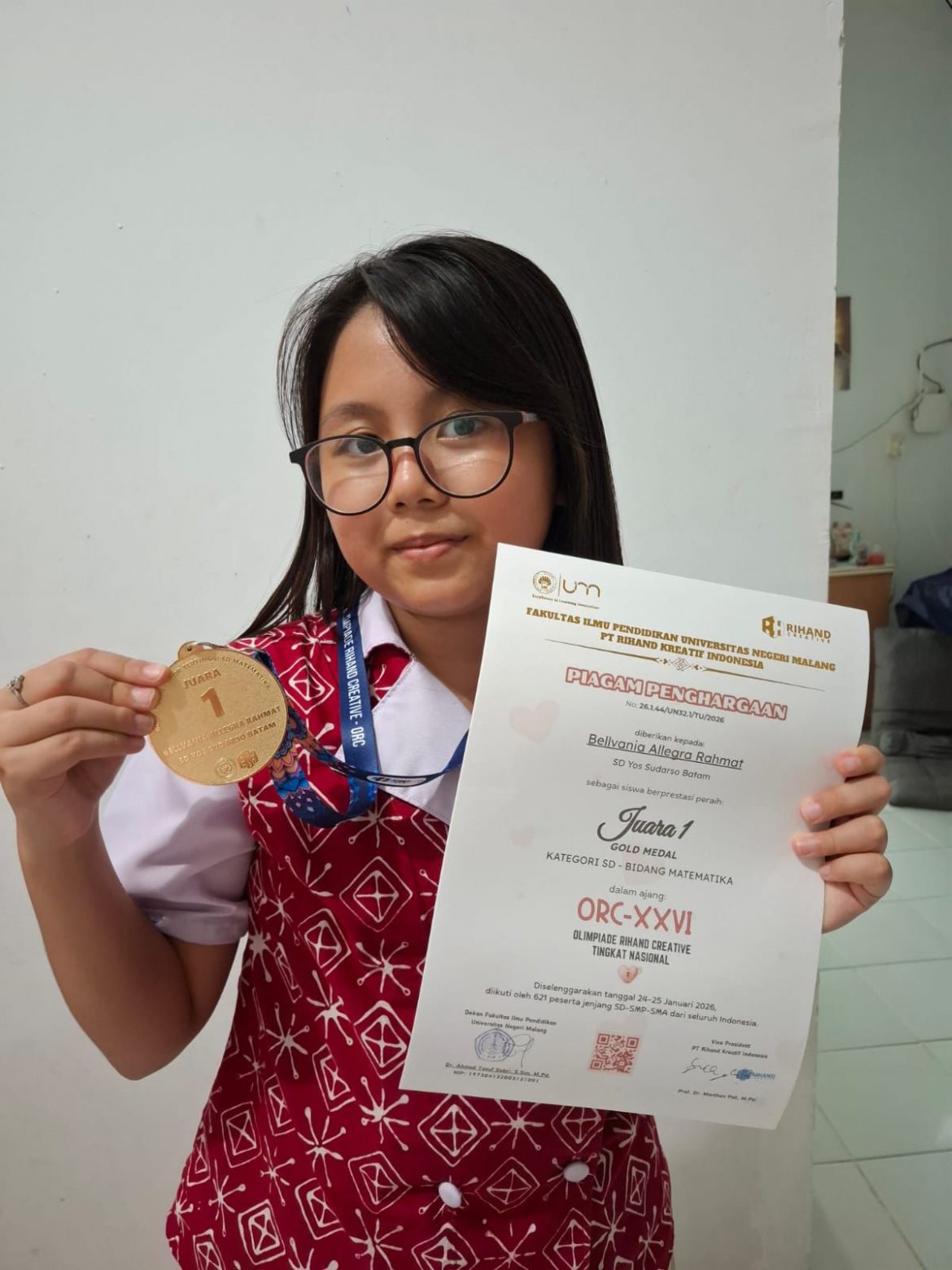 Prestasi membanggakan kembali diraih oleh siswa SD Yos Sudarso Batam Centre dalam bidang akademik. Bellvania Allegra Rahmat, siswi kelas 6C, berhasil meraih Juara 1 dalam Olimpiade Rihand Creative Nasional bidang Matematika yang diselenggarakan pada 24–25 Januari 2026 secara daring.