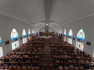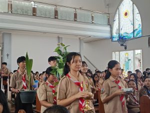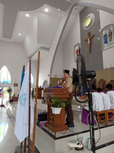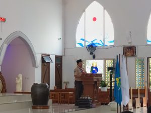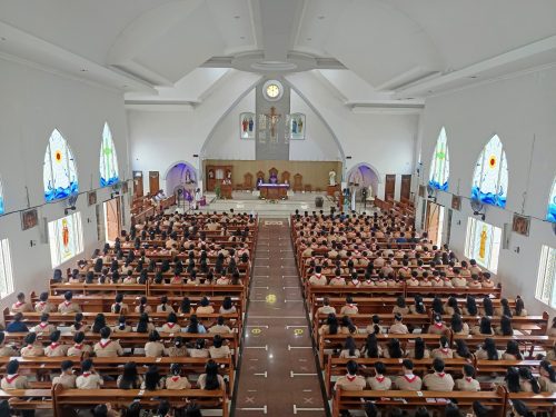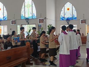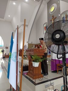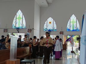 Dengan mengenakan seragam Pramuka lengkap, para peserta didik memasuki gereja dalam barisan rapi, membawa simbol-simbol kepanduan yang sarat makna. Suasana misa terasa istimewa karena memadukan nilai spiritual Katolik dengan semangat Dasa Dharma dan Tri Satya Pramuka yang menjadi pedoman hidup anggota Pramuka.