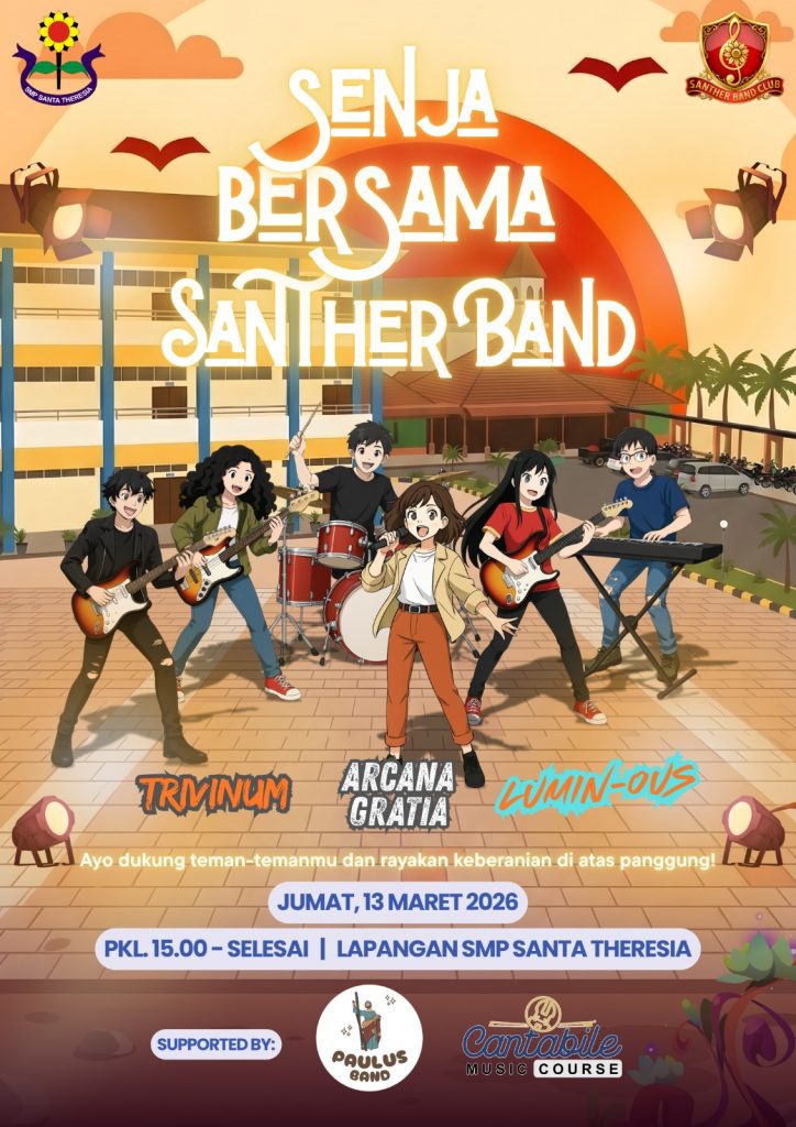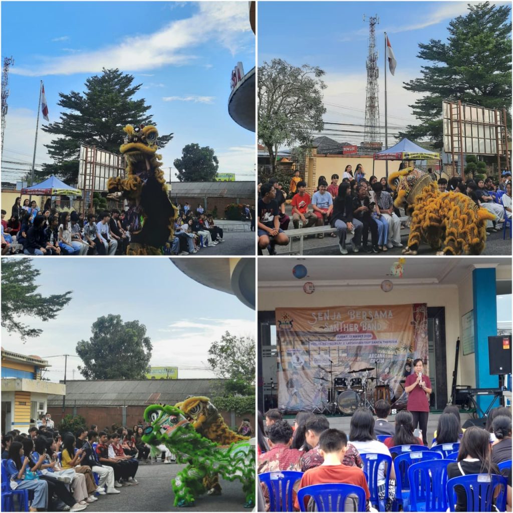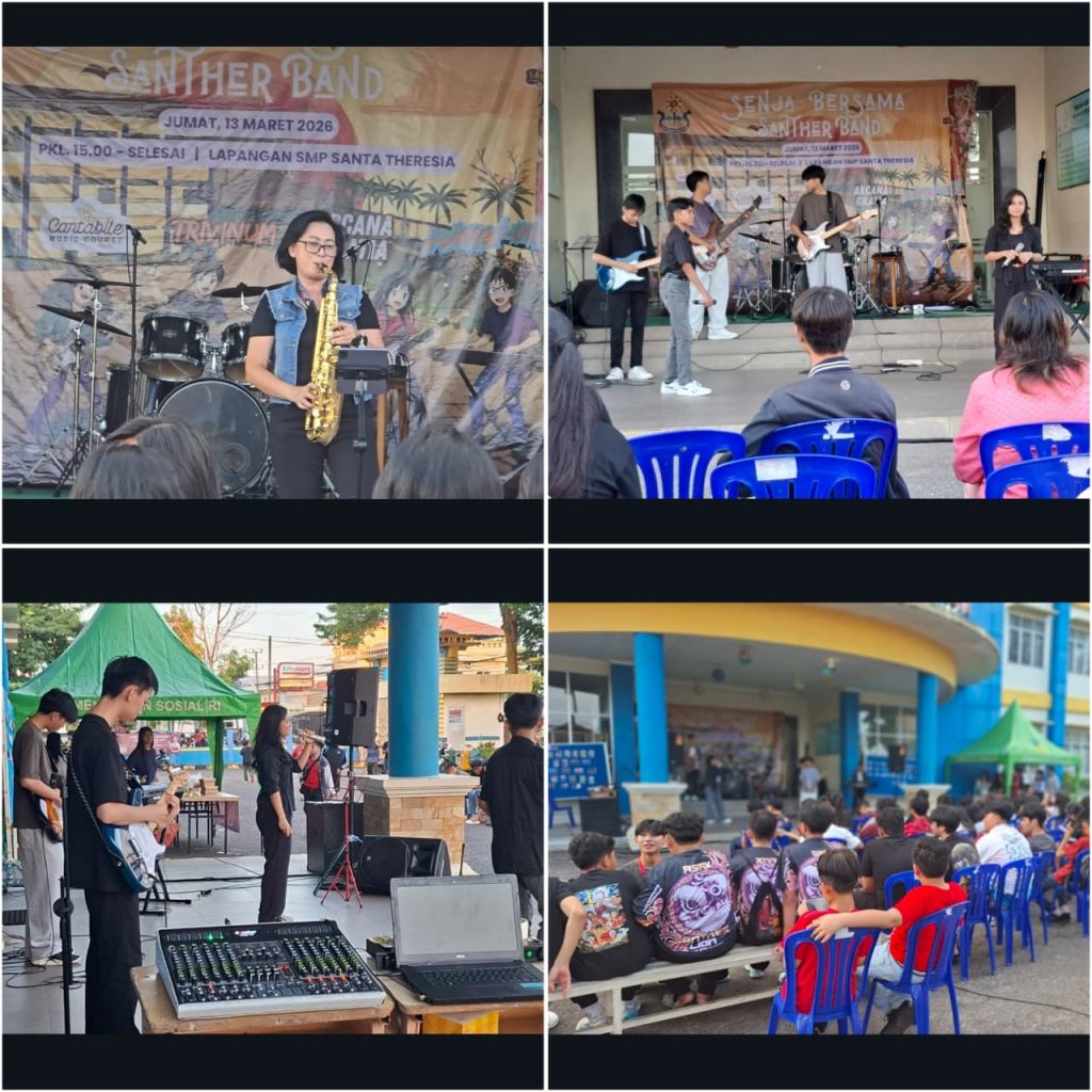 Pangkalpinang, YTKNews.id — Senja Bersama Santher Band menjadi moment tak terlupakan. Kegiatan kolaborasi yang digelar oleh ekstrakulikuler band SMP Santa Theresia yang berkolaborasi dengan ekstrakurikuler lion dance, modern dance, jurnalistik SMP Santa Theresia ini dilaksanakan pada 13 Maret lalu pada sore hari, menyambut datangnya senja. Kegiatan yang dilaksanakan di halaman SMP Santa Theresia ini juga mengundang klub band dari SMP Santo Paulus dan orangtua walimurid untuk bermain Saxosophone.